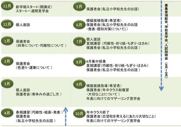 小学校受験を始めるにあたり、ひとりひとりに寄り添い、きめ細かな指導をいたしますので、年長クラスに無理なく移行できます。授業後に毎回マザーリングを行います。